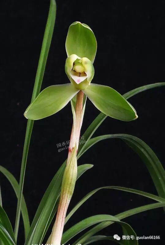 特征:株型紧凑,叶姿半垂间以斜立相混,中心叶片细狭,边叶稍宽。叶色深绿,质感糯润有光泽,弹性佳。叶片5-7张,叶长约27厘米左右,宽约0.9厘米左右。叶柄细收,叶缘锯齿细,叶面呈“V”字形,叶尖尖锐有芒刺状;花艺,五瓣分窠,外三瓣长脚圆头细收根,两侧萼片长脚偏狭,质厚糯,紧边,瓣端状似汤勺。拱抱绽放,一字肩。主瓣昂起头,神采飞扬。半硬蚕蛾捧心合抱蕊柱,紧边呈深兜状,捧端白头重,捧内侧有着放射状紫红竖条纹。小如意舌,向前平伸或微宕,花色净,舌面有清晰明亮的红色朱点。花守直径4.5-5厘米。花,翠绿色净,幽香。新芽淡水银红色,有淡紫色筋纹,芽尖锋有紫红彩和米粒状乳突。叶甲厚硬斜出;
