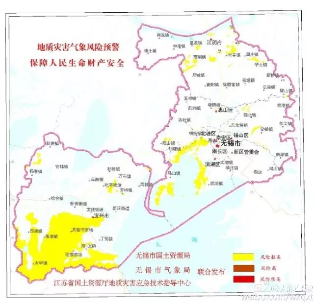 :受强降雨影响,预计6月27日14时至6月30日24时,无锡市惠山区、滨湖区、锡山区,江阴市华士镇、顾山镇、月城镇、南闸镇、临港街道,宜兴市西渚镇、张渚镇、太华镇、湖父镇发生滑坡、崩塌地质灾害的风险较高(黄 色预警),请以上地区相关部门加强巡查,注意防范!