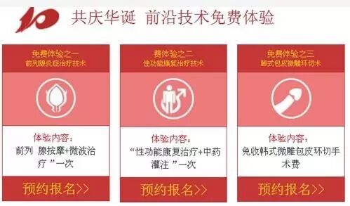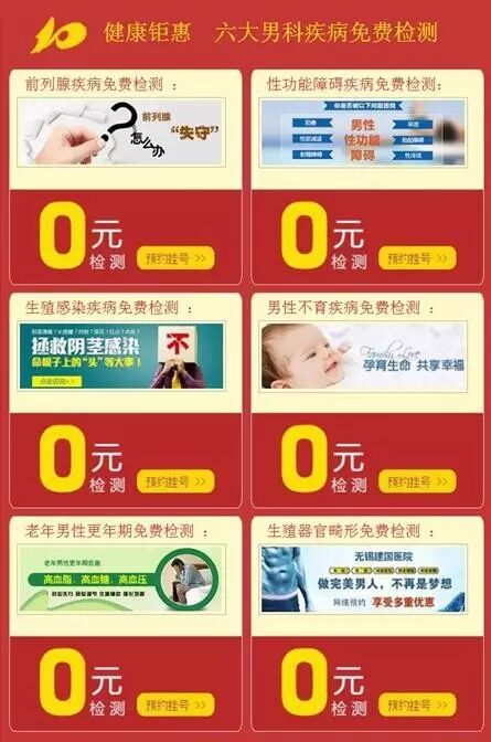 凡在该时间内通过网络、微信、电话等预约就诊的患者,均可获得100元代金券,可用于一次性充抵此时间内来院治疗前列腺疾病、性功能障碍、生殖感染、生殖整形、男性不育、老年男性更年期等六大疾病时所产生的检查或治疗费用。