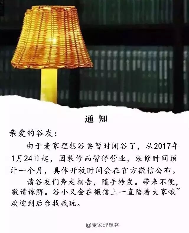 下周就是过年了,不知道你是否已买好回家的车票。嗯,我们这个“家”也准备开始大扫除了。是的,麦家理想谷要暂时闭谷了,从2017年1月24日起,因装修而暂停营业,装修时间预计一个月。由于装修会有一定的不确定性因素,具体开放时间会在微信上公布噢。当然,我想,我们再次相见的时间应该不会太远的。望广大小伙伴们,奔走相告,热情转发~