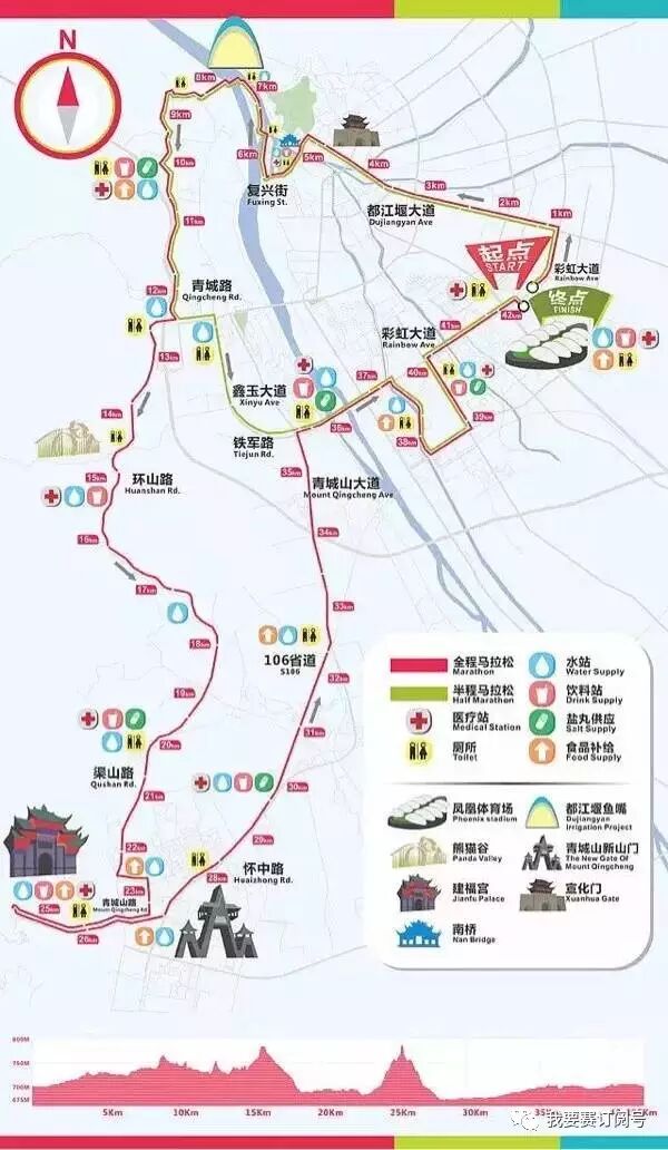 彩虹大道南段 (起点) —都江堰大道—宣化门—南桥—飞沙堰—鱼嘴—熊猫谷—建福宫(折返)—新山门广场—青城山大道—彩虹大道—凤凰体育场(终点)